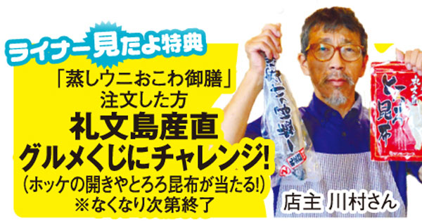 季節限定の「蒸しウニおこわ御膳」(1,280円)が登場!ウニは火を加えればさらに甘みが増します。ミョウバン不使用の本物のウニの味との出合いに目からウロコの人続出。ホッケフライやもずく酢も礼文産尽くし。