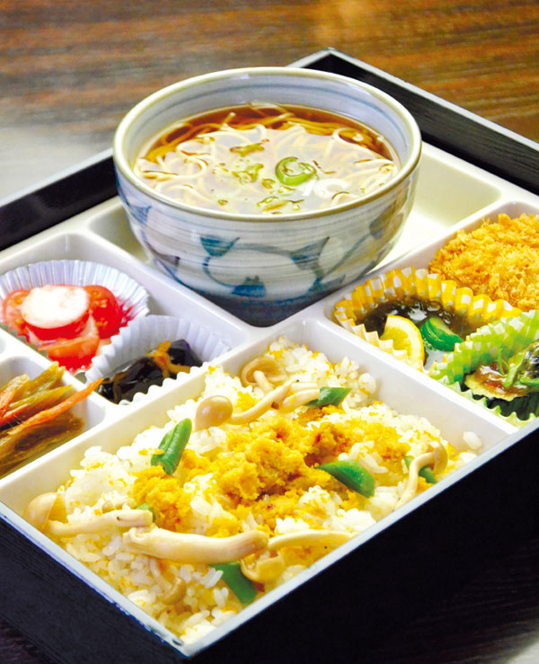 鮪やサーモンなど人気の握り5点に、巻き物、小鉢、そして寒い季節にうれしい温かい麺が付いた「にぎりセット」(980円)がおすすめ。居心地のよさについついおしゃべりに花が咲き、のんびりしてしまう人も多いとか。