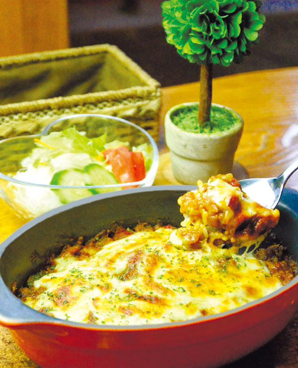 来年10周年を迎えるカフェの新メニュー「焼きチーズカレー(サラダ付、900円)」は、野菜の自然な甘みとスパイスの香りが広がるキーマカレーに、とろ~りチーズが絶妙!ランチタイムはミニデザート付きです。