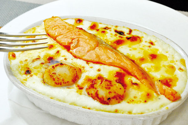 大振りの帆立貝と軽く燻製をかけたサーモンが大胆にのった名物ドリア。スープ、ミニサラダ、ドリンクが付くランチメニューは、パスタ、魚、肉料理など約10種類あり。旧旭川パレスホテルの総料理長を務めた下国シェフの味をリーズナブルに楽しめます。