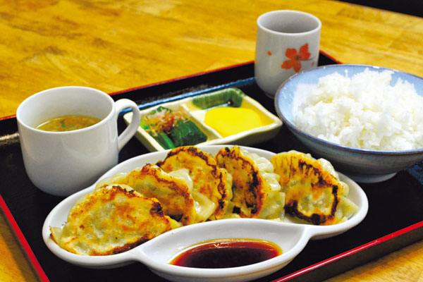 常連さんに愛されるのは、一般的な餃子の2倍はあるであろう12cmの皮に、知床豚の挽き肉、ニラ、白菜などをあわせた餡を端までたっぷり詰めた特大サイズの餃子。定食は餃子3個で635円、5個で975円。