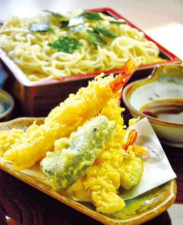 37年続くそば屋の人気は、「天然ゴールドブラウン海老の天ざる」1,500円。天然海老の旨みがプリッと弾けます。もりそば(500円~)のほか定食や丼ものも豊富!薄めや少なめなどの希望にも応じてくれます。