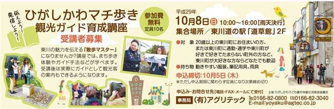対象は20歳以上の東川町民または東川町が好きな人で参加無料。定員は10名、参加を希望する人は10月5日(木)までに電話で申込して下さい。定員になり次第締め切り前でも受付を終了します。当日は動きやすい服装で、筆記用具、雨具を持参の上、東川道の駅「道草館」2階に集合。午後4時終了予定です。問い合わせ、申込は事務局の(有)アグリテック(Tel0166・82・0800/メールyoyaku@agtec.co.jp)へ。