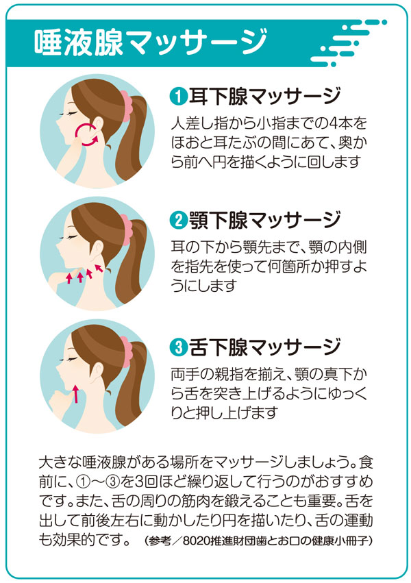 唾液には細菌の数や活動を抑えたり、口臭を軽くしたりするはたらきがあるので、分泌量を増やすことが重要なのだそう。物をよく噛む以外にも、舌の体操や唾液腺マッサージ(下記参照)などの方法があるので、お口の乾きが気になる人は試してみては。