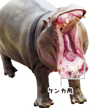 草をすりつぶす奥歯のほかに、下あごに牙が生えている。噛むためじゃなく、オス同士がケンカするためだけにある。歯磨きは、檻にめっちゃこすり付けて磨く。ワイルドだろぅ?