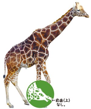前歯は上だけ歯がない(歯がない!?w)。下の前歯と上の歯茎で草をちぎって、奥歯で咀嚼するそう。全然関係ないけど明石家さ●まさんの前歯はインプラントとの噂。