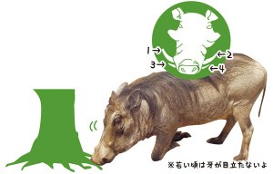 木の根っこを食べる。口の横から牙が出てる。4本も。えっ、威嚇してんの?ツッパってんの?
