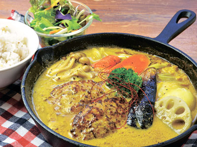迷ったらまずオーダーしてほしいのが、あいがけカレー。看板メニューの特製スパイスカレー(黒色)と、フルーティな甘みがクセになるマイルドカレー(黄色)が一度に楽しめます。上富良野産豚ロースのカツがのった特製スパイスカツカレーも人気。洋食では、懐かしのナポリタンや、新登場のとろとろ卵のオムライスハヤシがおすすめ。全メニューにサラダが付きます。