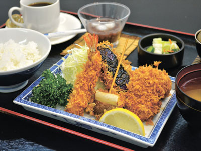 良質な肉はもちろん、揚げ油やパン粉まで厳選したとんかつは箸で切れるほど柔らか。レディースセットAは、あっさりとした味わいのヒレ一口かつ、サクサクの海老フライ&コロッケ、2種の野菜フライなどが付いたお得なセットです。サイドメニューも充実し、ご飯や味噌汁、キャベツはおかわり自由。ヒレチーズかつ入りのレディースセットBもあり、どちらも男性も注文できます。