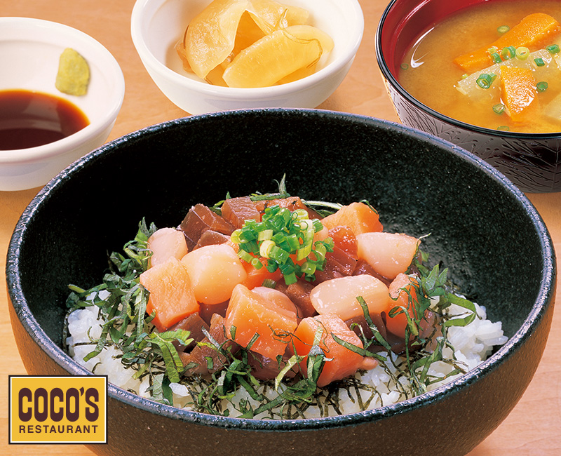 オリジナルのタレに漬け込んだキハダマグロ、ビンチョウマグロ、サーモン、イタヤ貝柱をご飯に乗せた、一度にたくさんの味わいを楽しめる海鮮丼。ご飯と海鮮の間には、海苔とシソが敷いてあるので、さっぱりといただけます。みそ汁と漬物付き。期間・数量限定での販売なので、海鮮好きはお見逃し無く!