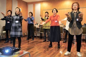 スクリーンに映る専用の映像に合わせて、ザ・ピーナッツの「恋のバカンス」やあみん「待つわ」といった誰もが口ずさめる昭和のヒットソングに、簡単な振りをつけて歌います。和気あいあいとした雰囲気ながら、音程をとるパート練習や振り付けの確認などなかなか熱心。みなさん本気のご様子です。