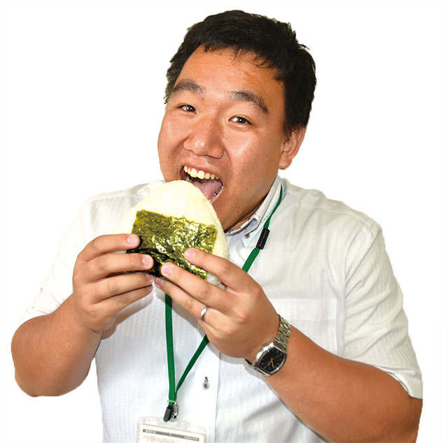 「撮影のため、ななつぼしでおっきなおにぎりを作ってみました!」。なんて幸せそうに食べるんだろ~
