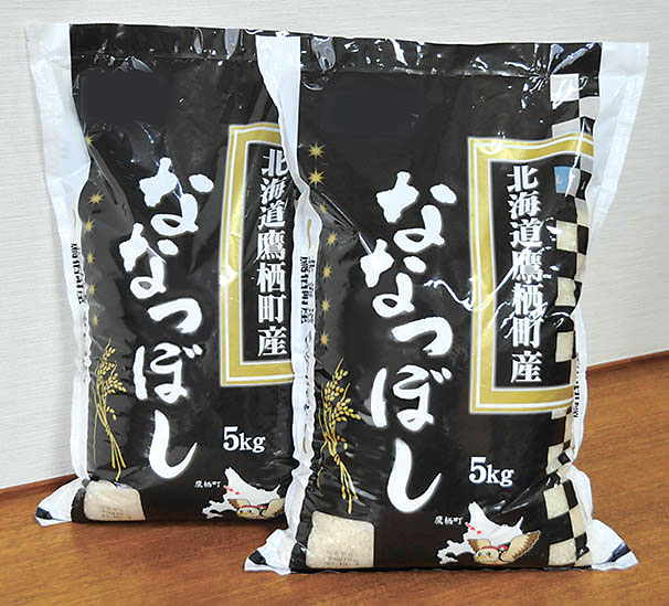 - 珍しい黒系パッケージの「鷹栖町産ななつぼし」。鷹栖米クーポン券は1袋につき1枚まで利用できます