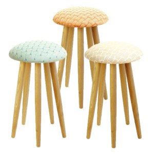 どんぐりの木である北海道産のナラ材を使ったスツール。四角形より五角形の方が19%倒れにくいことに着目したら(なんだか難しい計算式があるみたい……)、丸みのある生き物のようなユニークなフォルムになりました。脚のジョイント部分は伝統工法の打ち込み楔で強度を持たせてあり、見えないところにも家具職人のこだわりが。脚の高さは3種類あるので、身長や使うシーンに合わせて選べます。座ってみると確かに安定感あり!ぜひ、ショールームで実際に座ってみることをおすすめします。柄の種類は、ノーマル(7色)、和柄(3色)、アンティーク(2色)と豊富なので、インテリアに合わせてチョイスして。