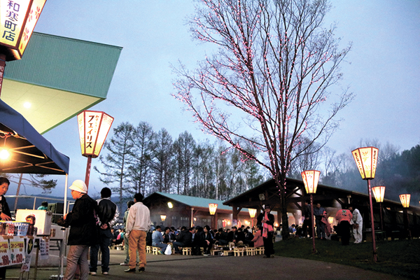 山全体に植栽したエゾヤマザクラを観賞しようと始まったイベントで、当初は頂上の展望広場で昼の桜を楽しんだようですが、ふもとが整備された現在はふれあいのもりで実施しています。頂上に比べ、桜の木は少ないけれど…、桜色のイルミネーションに囲まれて、ほら、正直みんな、花より団子でしょ(笑)。私は、商工会で販売中のジンギスカン券1000円(和寒ジンギスカン・野菜・おにぎり付)を購入し、生バンド演奏やカラオケ大会、大抽選会などと共に楽しむのがここ数年のパターンですね。