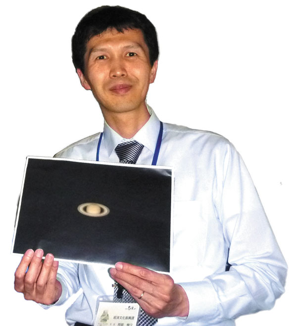 「過去には、星空がきれいに見える街のランキング1位に選ばれたことがあるんですよ」と美瑛の星空の美しさに胸を張る荒明さん。持っている写真は、まさしく土星の環!