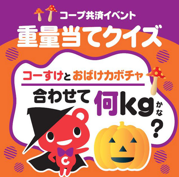 コープ共済では、マスコットキャラクターの「コーすけ」とおばけかぼちゃの合計重量を当てるイベントを企画しています。