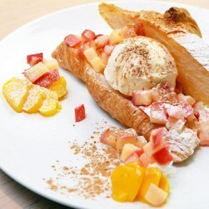 「アップルパイだけどアップルパイではないもの」という無理難題から完成したのが、クロワッサンとりんごの組み合わせ。プレートメニューで提供している人気のクロワッサンに、食感を残してじっくり煮詰めた角切りりんごとバニラアイスをサンドしました。ふんわり香るシナモンがアクセント♪ありそうでなかった、新しいデザートです。