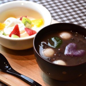 女子ってなにが好きなんだろうととにかく画像を検索しまくりました(笑)。そうすると出てきたのがカラフルなお汁粉。これなら若い女の子も好きな気がして、色付きの白玉とフルーツをたっぷり使うことにしました。アイスにお汁粉の残った餡をかけて食べるアイデアは、店主の実体験から。家に雪◯だいふくがあり、お汁粉に入れてみたらおいしかったらしく、今回はバニラアイスにかけることにしました。試作の時に食べましたが、アイスとあたたかい餡の相性最高です♡