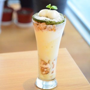 ビル最上階にあり、室内に居ながら緑を感じられるガーデンカフェ。冬もいいけれどやっぱり春が待ち遠しいから、雪どけをイメージしたパフェを作ってもらいました。宇治抹茶とホワイトチョコでしっとり焼いたベイクド抹茶の下に、ミルクパンナコッタとバニラアイス。溶けかけの雪(白玉)から若葉がひょっこり顔を出します。