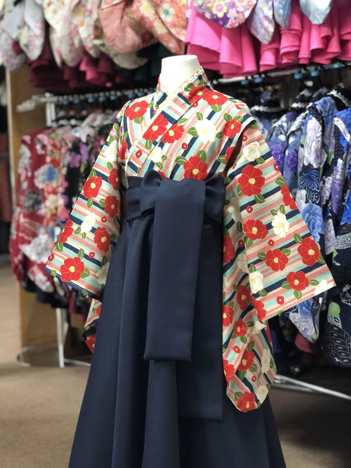 普通の着物と違って丈が短く、袴風スカートのウェストは総ゴムなので着付けが簡単でトイレも楽々です。