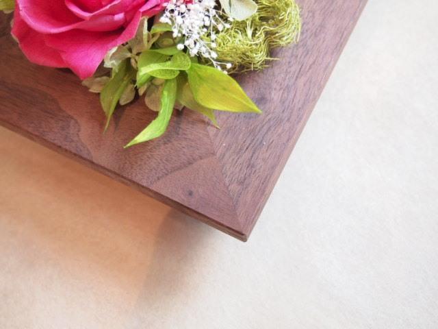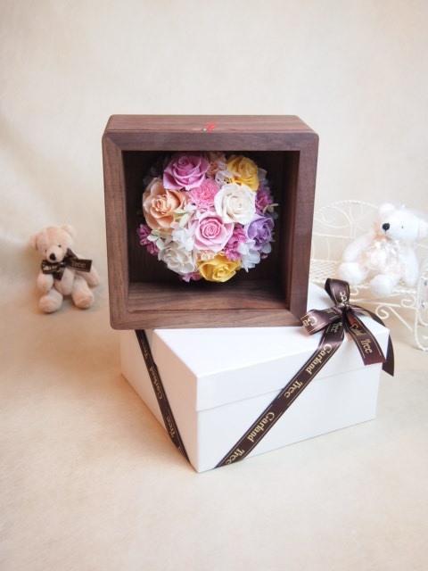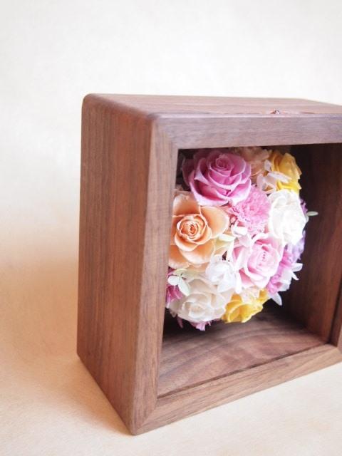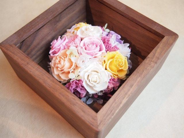 ブラックウォールナット無垢材をコンパクトなアクリルガラス付のBOXにデザイン致しました。その中に包まれるようなラウンドブーケにデザインされたプリザーブドフラワー、当店のデザイナーが一つ一つ丁寧にアレンジ致しました。
