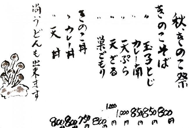 秋限定で7種類の道産きのこ(しいたけ、ぶなしめじの白・黒、舞茸、たも、えりんぎ、えのき)を使った特別巣ごもりを提供中。生きのこを使っているので、良い出汁がでている。巣ごもりとは、揚げた蕎麦にそばつゆベースのあんかけをたっぷりかけたもの。昔はお酒のお供として親しまれた一品。