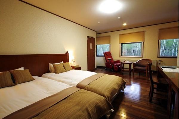 窓際にマッサージチェアを1台ご用意。森を眺めながらマッサージチェアでおくつろぎください。バスタブなし、シャワーブース・ウォシュレットトイレつきです。