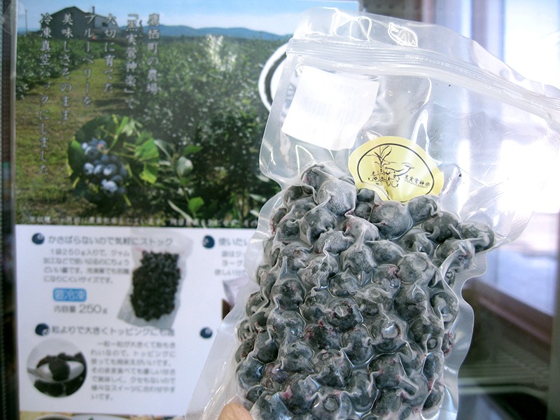 - 鷹栖の広大な農場で夏の収穫時期に冷凍保存したブルーベリーを真空パックにして販売しています。
