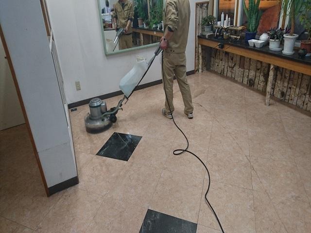 - 某 美容室の床清掃風景です。ポリッシャーという床みがき機を使用して洗剤で洗浄し、ワックスを塗布します。床ワックス剥離清掃も承ります♫