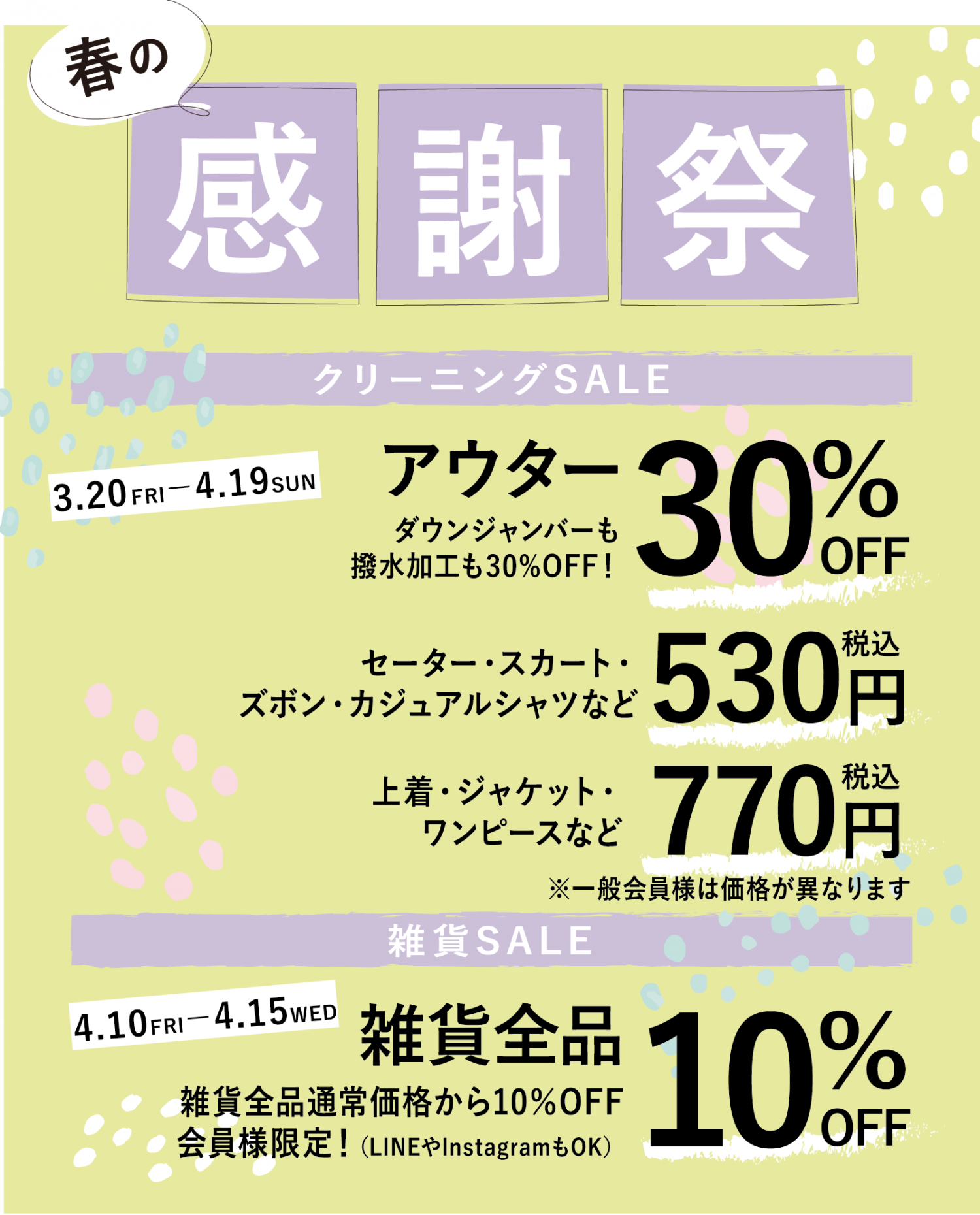 3/20〜4/19はクリーニングセール。ダウン、コートから一般の衣類までお得にご利用いただけます。