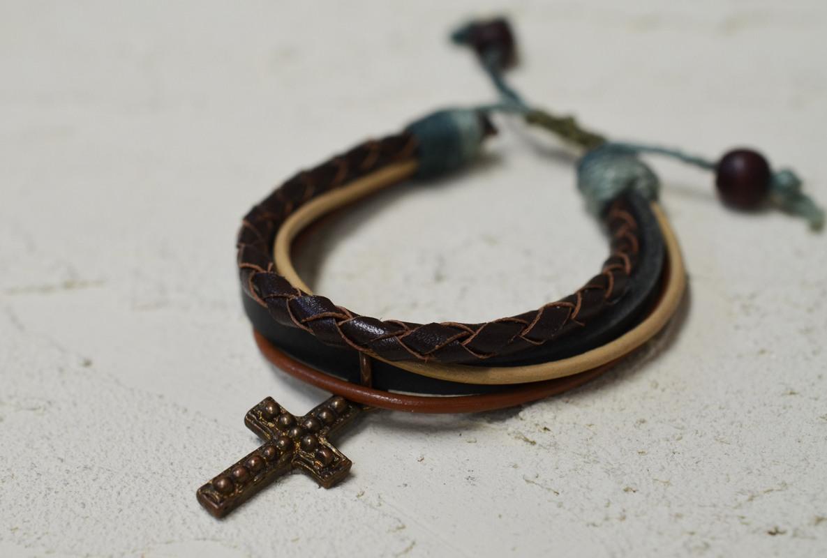 火曜日定休革紐を使って四つ編みにしたものと、いろいろな色の丸革紐を合わせたブレスレットを作ります。