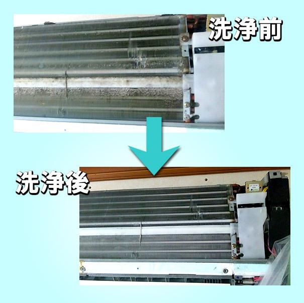 色んな業者がいてたまに苛性ソーダーで洗浄している場合があるので注意してください。洗浄後は、見た目に内部のアルミフィンがキラキラしてるので「キレイになった」と思いがちですが、アルミの表面を溶かしてエアコンそのものの寿命を短くしてる場合もあります。写真で分かる様に、洗浄後もアルミ独特の色合いに変化はおこしませんので注意してください。