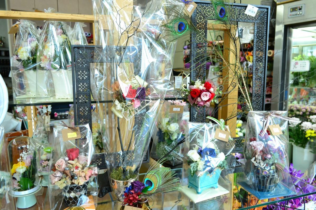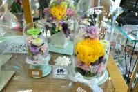 当店では、販売だけでなくフラワーデザインスクールの生徒が作成したフラワーを展示しています。