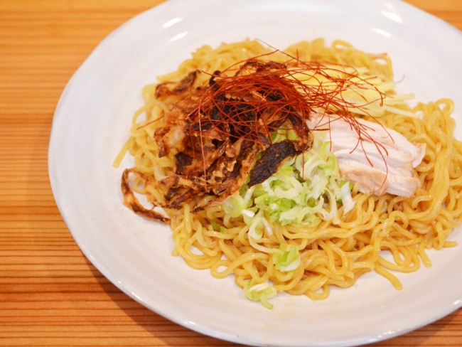 自慢の鶏ガラスープをベースにしたピリ辛タレで食べる新作ラーメン。暑い日もつるりといけちゃいます。かき混ぜてどうぞ♪