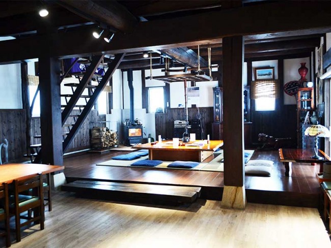 太いむき出しの梁などは当時のまま。壁は新たに真っ白く塗り、店の奥には囲炉裏もあります。古きよき日本の伝統を感じていただけると思います。
