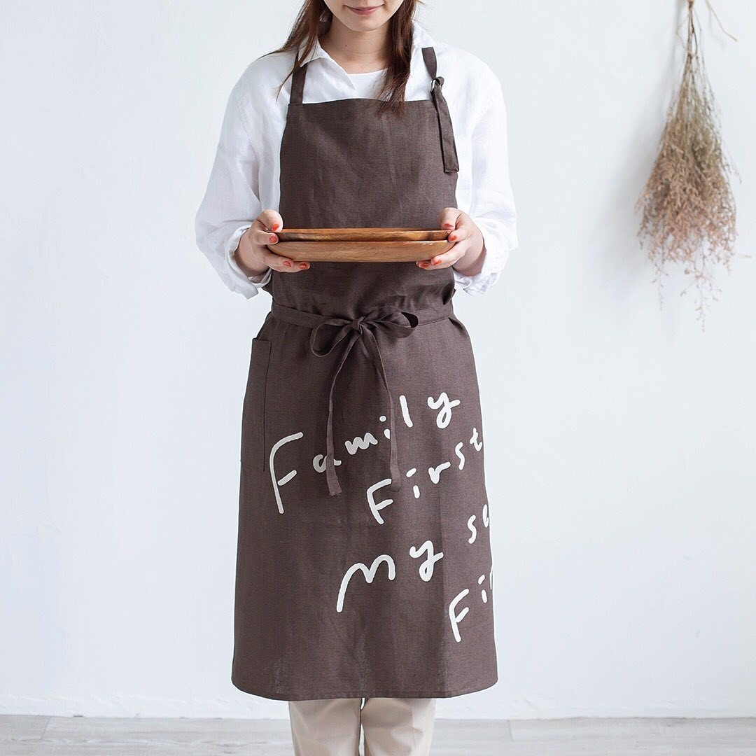 - ナチュラルな風合いが魅力の麻素材に大きなロゴがアクセント。長め丈なので長身さんや、ワンピースやロングスカートへの油はねが気になる方にオススメです。